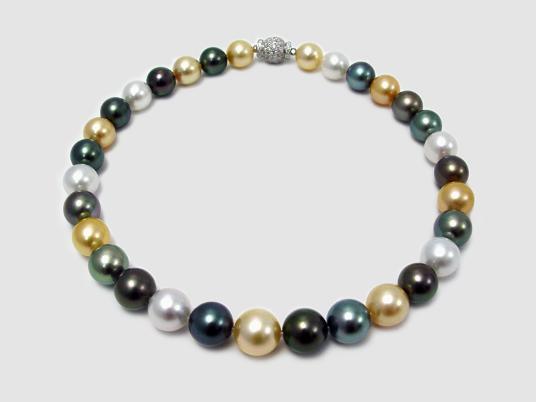 · Item Number: TP12MULT · 12~13.5mm Multicolor Pearl Strand · Tahitian, Golden & White South Sea Pearls · 2.45tw Diamond Ball Clasp · Platinum |