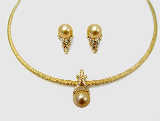 Natural Color Golden South Sea Pearl Necklace & Earrings with Diamonds |